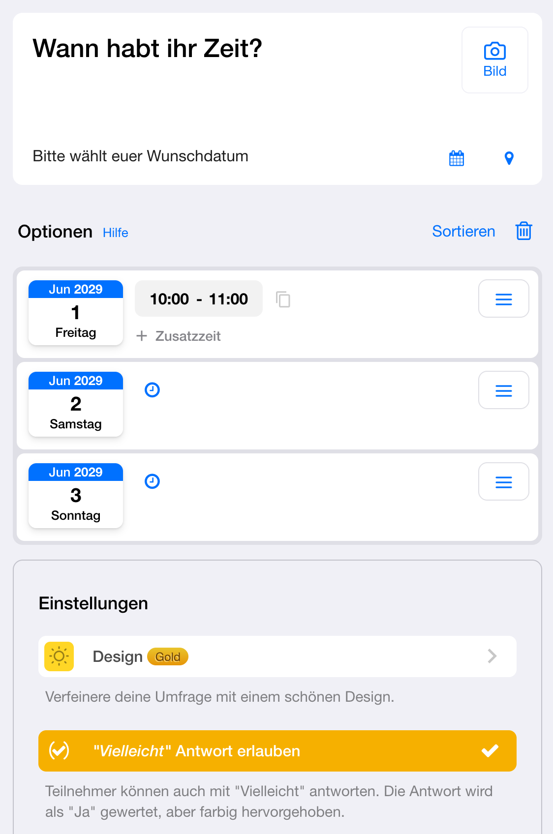 Diese URL füllt das Umfrage-Formular automatisch vorab aus mit dem Title "Wann habt ihr Zeit?", der Beschreibung "Bitte wählt euer Wunschdatum" und erstellt Optionen mit den Daten "01.06.2029 von 10:00 bis 11:00 Uhr", "02.06.2026" und "06.06.2026". Darüberhinaus aktiviert es die Einstellung "Vielleicht-Antwort erlauben".