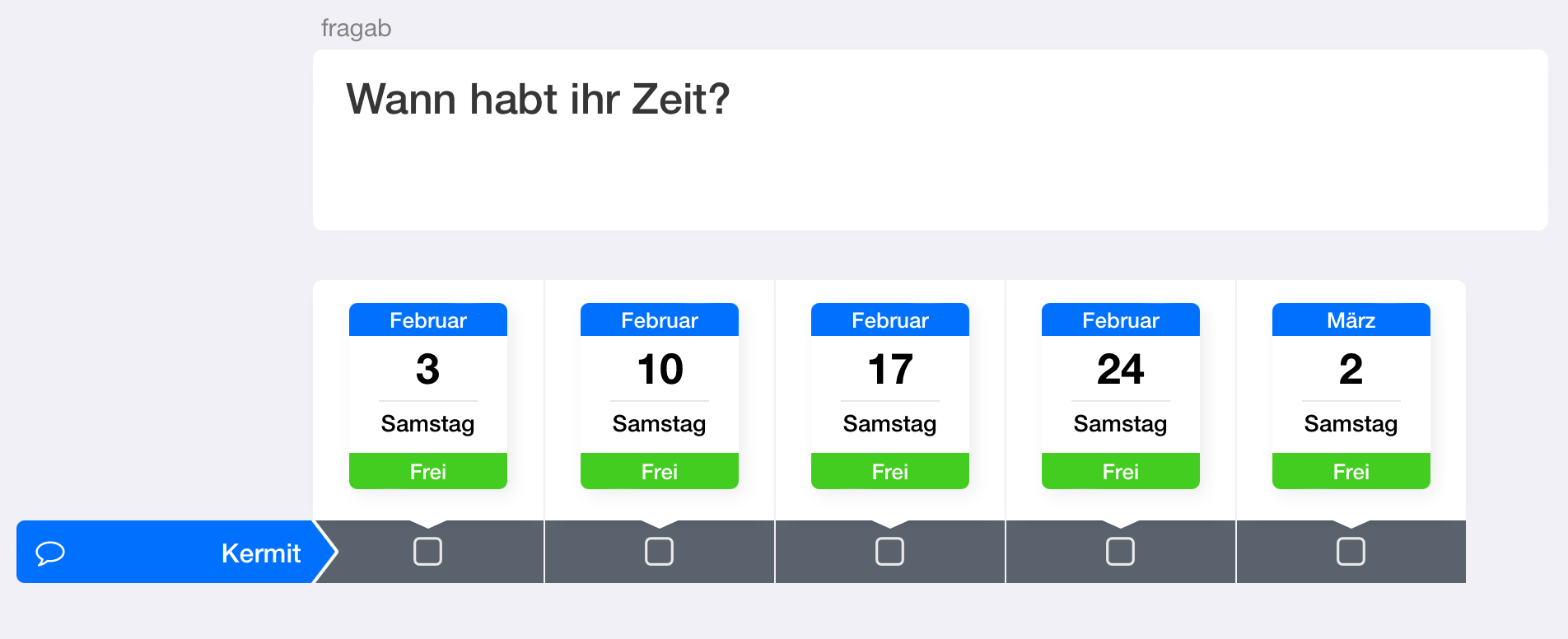 Mit fragab kannst du deinen Kalender sogar bequem integrieren. Dadurch siehst du, ob du an den entsprechenden Daten bereits Termine hast, oder noch frei bist.